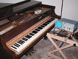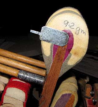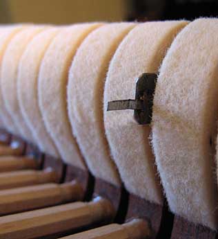 left picture: Flag installed on note E4 of S&S model "M". The flag is read about 6 mm below string contact. right picture: The flag hot-melt-glued to the side of action model hammer.
