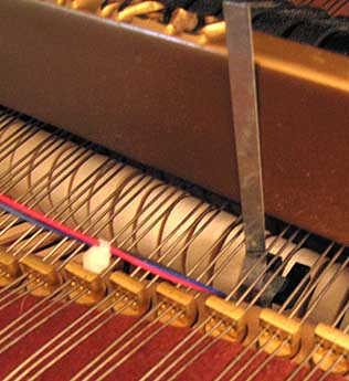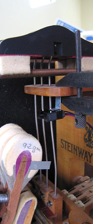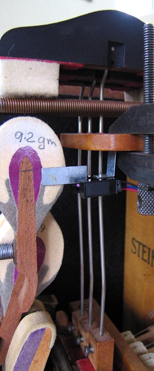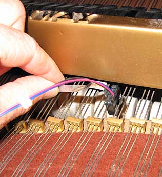 Installation in Steinway "M" left picture: The opto -- on its supporting strip of galvanized flashing -- is in place between two unisons. The strip will be clamped to the capo. right picture: Inserting the opto between the unisons. |