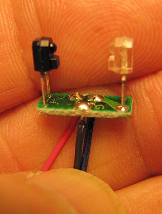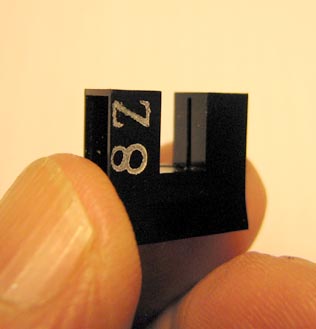 left picture: The innards of the opto sensor. The black case houses the photo-transistor, while the clear case houses the LED. right picture: The opto housing. The slot (vertical in this picture) is 0.5 mm wide. I designed this opto pair for HP. The slot had to be this wide in order to capture enough of the LED illumination because of the very wide 5 mm gap between the two legs. |