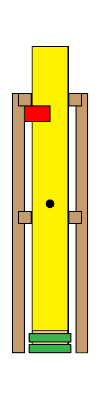 Here's a sketch which illustrates how the thumper works. When the yellow brass rod is in its down position (roll pin resting on lower guide), about an inch of rod protrudes above the upper guide -- sufficient for a finger grip. The roll pin (black dot) limits rod travel when the rod is drawn up for a test blow. The red rectangle is a stop block which stops the roll pin when the rod is drawn up for naturals. For sharps, the rod is rotated so that the roll pin misses the block -- and stops against the upper guide.