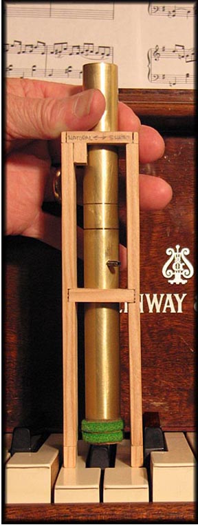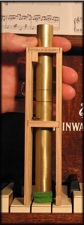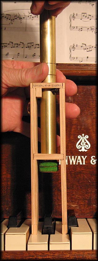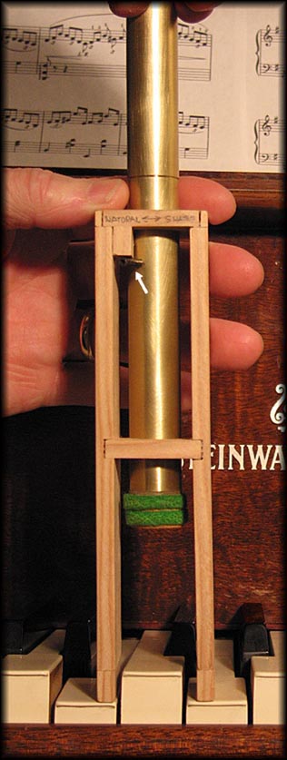 THUMPER POSITIONED FOR A SHARP left picture: The cage fits nicely between the keys as shown, and when the naturals are depressed, establishes the reference height for the test blow on the sharp. The pin is rotated so that it passes the stop block and stops underneath the guide; this sets the correct test-blow distance for the sharp. right picture: Sharp test blow completed. |