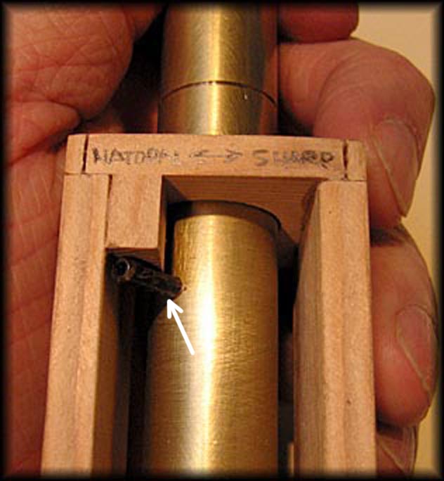 Notice the roll-pin (arrow) is under the stop block in the left picture, while in the right picture the rod has been rotated so that the roll pin misses the stop block. The two rotation positions of the rod determine whether the test-blow will be for a natural, or for a sharp. [Ignore the scribed rings in the rod -- this is a prototype which was used to try many ideas!]